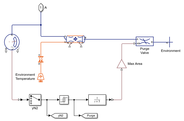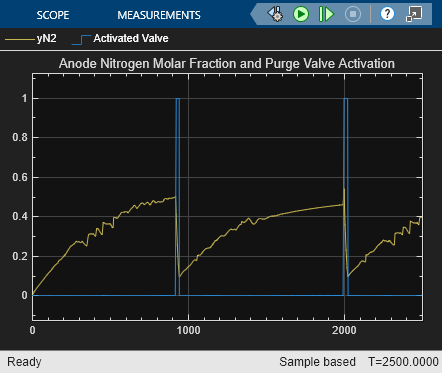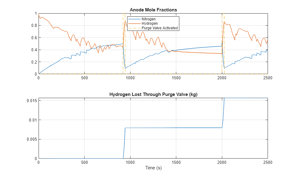 This plot shows the molar concentrations of nitrogen and hydrogen in the fuel cell anode. Higher concentrations of nitrogen correspond to lower concentrations of hydrogen and lower fuel cell performance. This system has a purge valve for the purpose of maintaining high hydrogen concentration in the anode. The valve opens when the nitrogen molar concentration in the anode exceeds 50% and closes when it returns to 10%. When the purge valve opens to expel nitrogen, it unfortunately also expels hydrogen. Therefore, fuel cell purge valves typically require carefully designed control strategies.