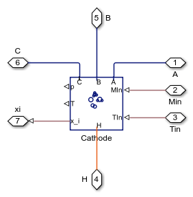 The output ports xi of the anode and cathode gas channel blocks provide the gas mole fractions needed to model the fuel cell reaction. The block models the removal of H2 and O2 from the anode and cathode, respectively, and production of H2O due to the chemical reaction. Water vapor travels across the MEA. The heat generated by the reaction is sent through the thermal port H to the connected Thermal Mass block. Refer to the comments in the code for additional details on the implementation.