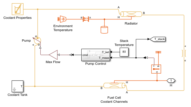 The temperature and relative humidity in the fuel cell stack must be maintained at an optimal level to ensure efficient operation under various loading conditions. Higher temperatures increase thermal efficiency but reduce relative humidity, which causes higher membrane resistance. Therefore, in this model, the fuel cell stack temperature is kept at 80 degC. The cooling system circulates coolant between the cells to absorb heat and rejects it to the environment via the radiator. The humidifiers saturate the gas with water vapor to keep the membrane hydrated and minimize electrical resistance.