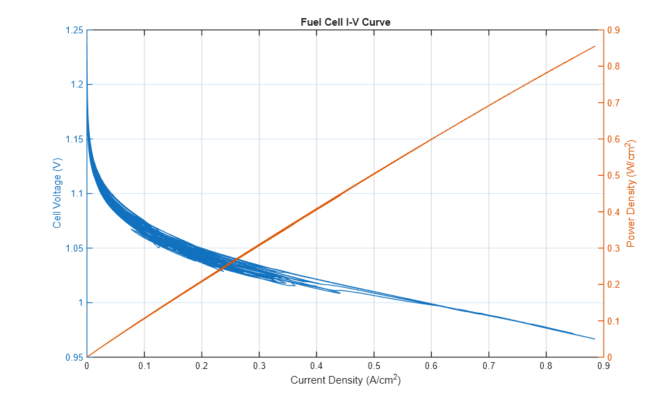This plot shows the current-voltage (i-v) curve of a fuel cell in the stack. As the current ramps up, an initial drop in voltage occurs due to electrode activation losses, followed by a gradual decrease in voltage due to Ohmic resistances. Near maximum current, a sharp drop in voltage occurs due to gas-transport-related losses.