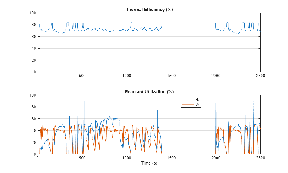 This plot show the thermal efficiency of the fuel cell and its reactant utilization fraction. The thermal efficiency indicates the fraction of the hydrogen fuel's energy that the fuel cell has converted to useful electrical work. The theoretical maximum efficiency for a PEM fuel cell is 83%. However, actual efficiency is around 60% due to internal losses. Near maximum current, the efficiency drops to around 45%.