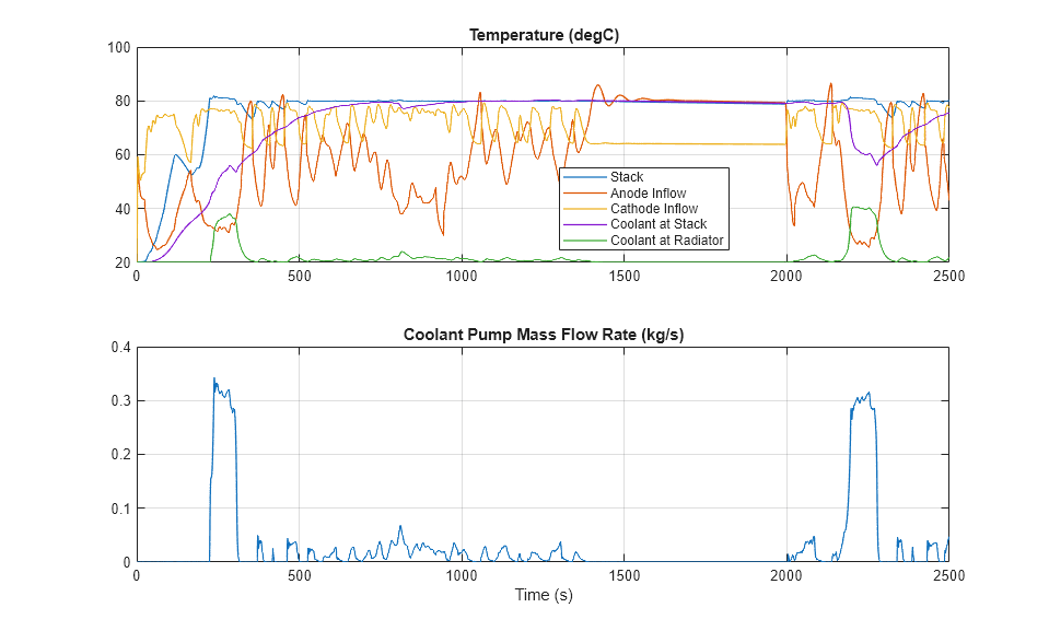 Maintaining an optimal temperature is critical to the operation of the fuel cell because higher temperatures lower the relative humidity which increases the membrane resistance. In this model, the cooling system is operated by a simple control of the coolant pump flow rate. The plot shows the temperature of the coolant after it has absorbed heat from the fuel cell stack and after it has rejected heat in the radiator.