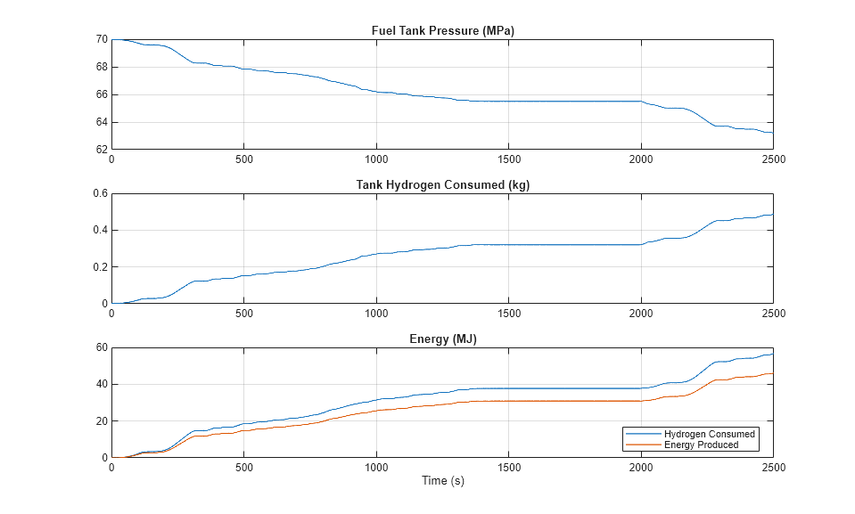 This plot shows the mass of hydrogen used during operation and the corresponding decrease in the hydrogen tank pressure. The energy of the consumed hydrogen fuel is converted to electrical energy.