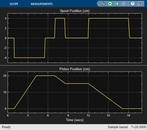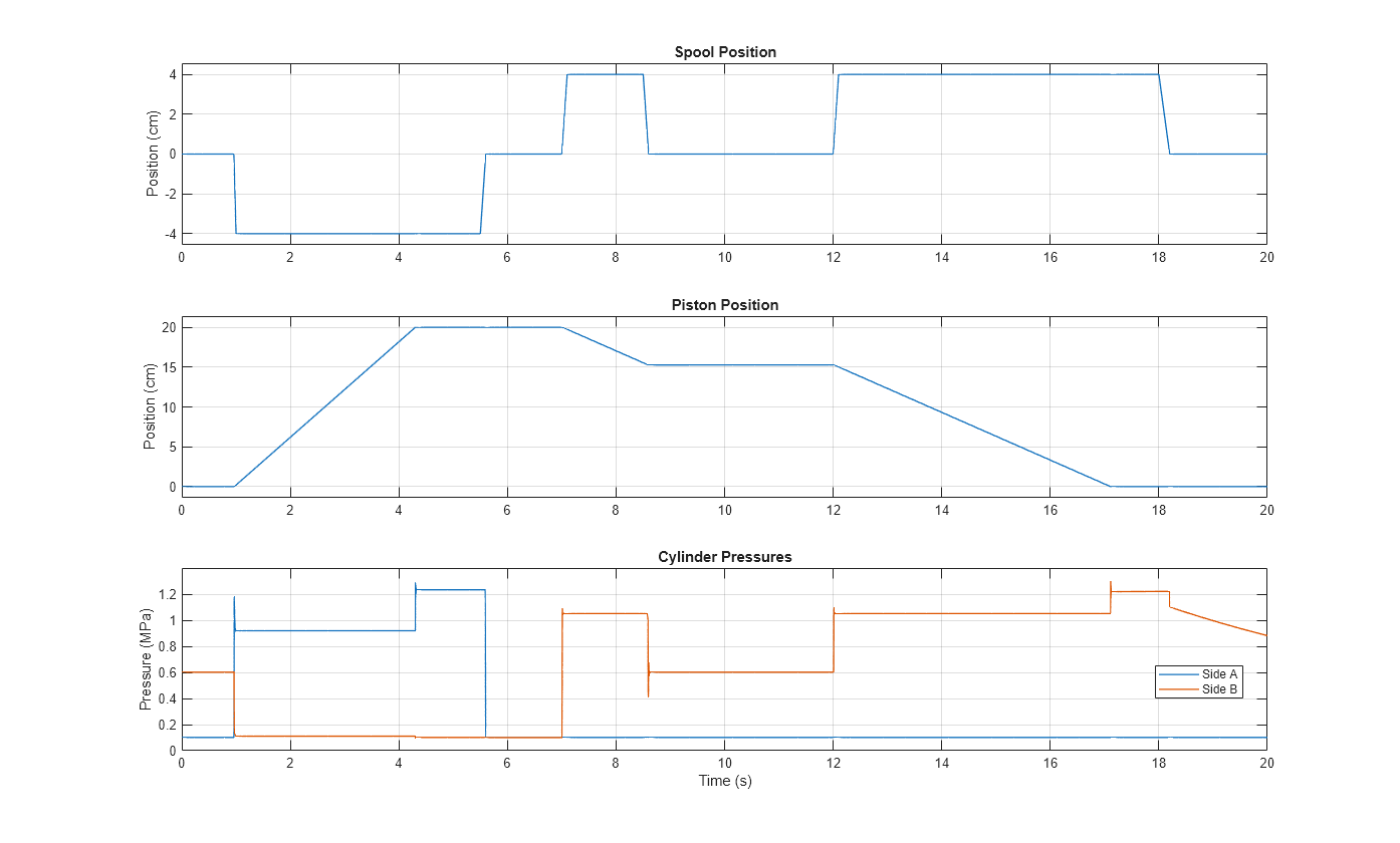The plots below show the pressures in the cylinder with the positions of the spool and piston.
