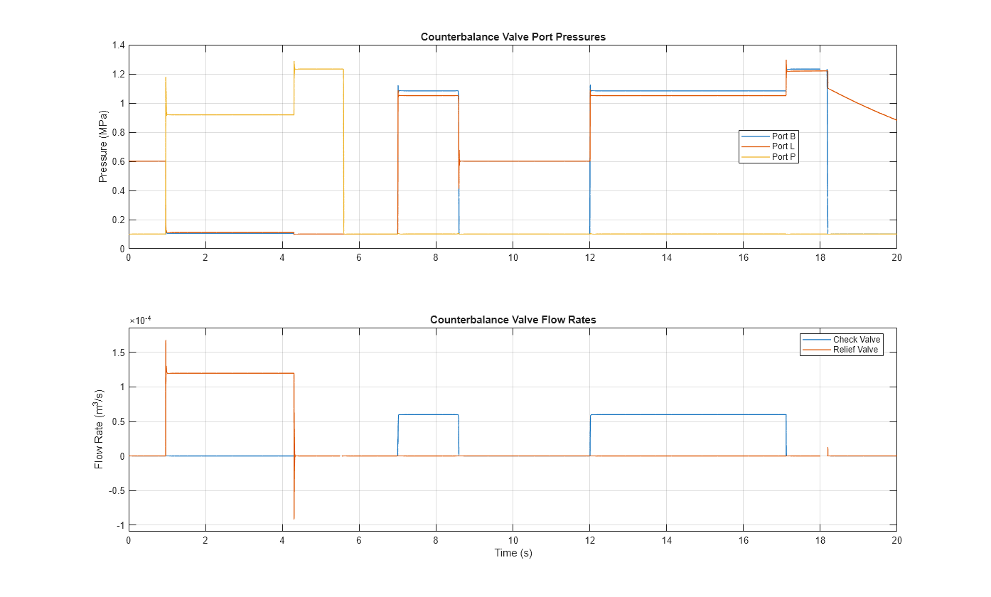 The plots below show the port pressures and flow rates of the counterbalance valve.