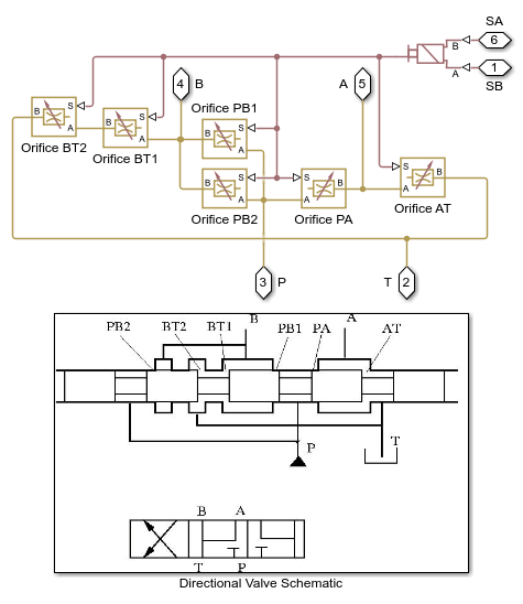 The cylinder is loaded with an overriding load, which requires the use of counterbalance valves to prevent the load from creeping when the directional valve is in the neutral position. The actuator is equipped with a custom model of a 3-position, 4-way directional valve. The valve connects actuator ports A and B to tank in neutral position, while blocking the pressure port P. Ports A and B are connected to port P if electromagnet A is energized. This causes the cylinder to extend due to the difference in the cylinder effective areas. The piston retracts as electromagnet B is energized.