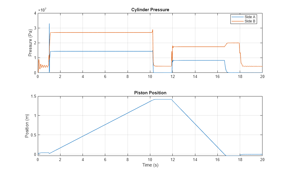 The plots below show the pressures in the cylinder and the position of the piston.