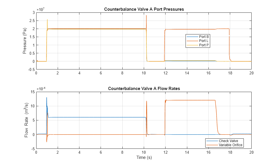 The plots below show the port pressures and flow rates for counterbalance valve A. In the first part of the cycle, flow is observed through the check valve in the counterbalance valve. During the second part of the cycle, flow rate through the variable orifice is observed, indicating that the ports at P and L create enough force to overcome the spring force and open the valve.