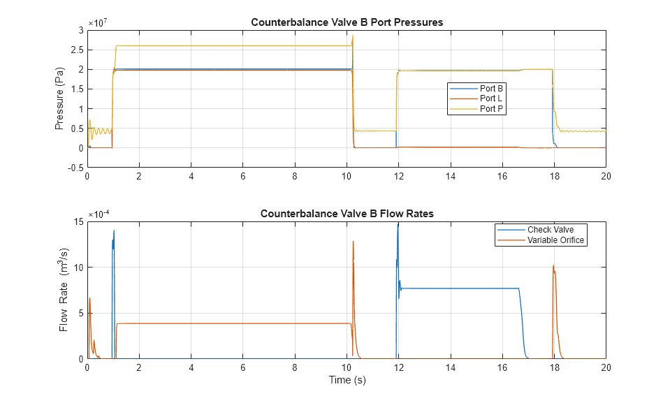 The plots below show the port pressures and flow rates for counterbalance valve B. During the first part of the cycle, flow rate through the variable orifice is observed, indicating that the ports at P and L create enough force to overcome the spring force and open the valve. In the second part of the cycle, flow is observed through the check valve in the counterbalance valve.