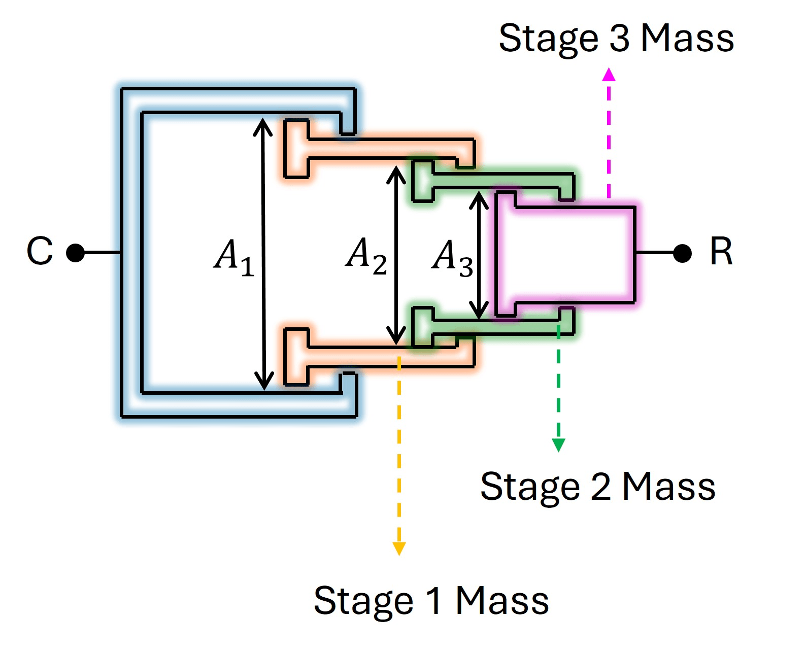The effective areas of the stages are , , and , respectively, and the mass of each stage is .