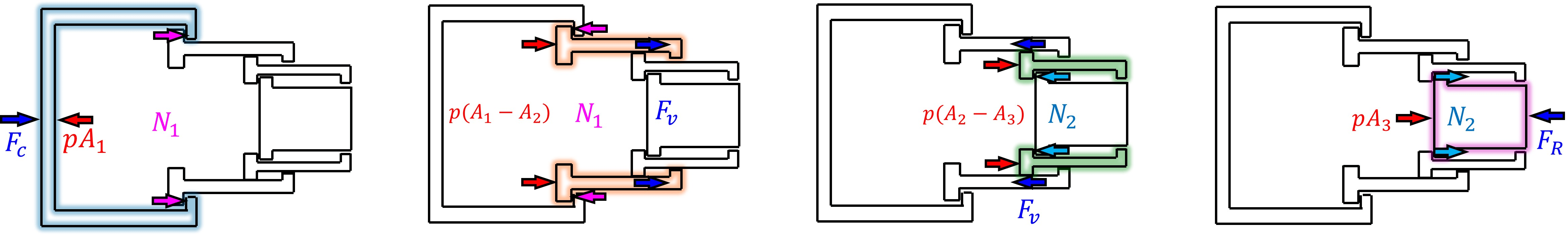 These free body diagrams illustrate the forces acting on different parts of the cylinder during the period when the second stage extends with a constant velocity.