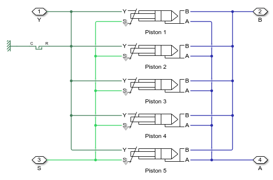 The pistons are identical and are modeled in their own identical subsystems. They are all connected to the following ports of the pump model: