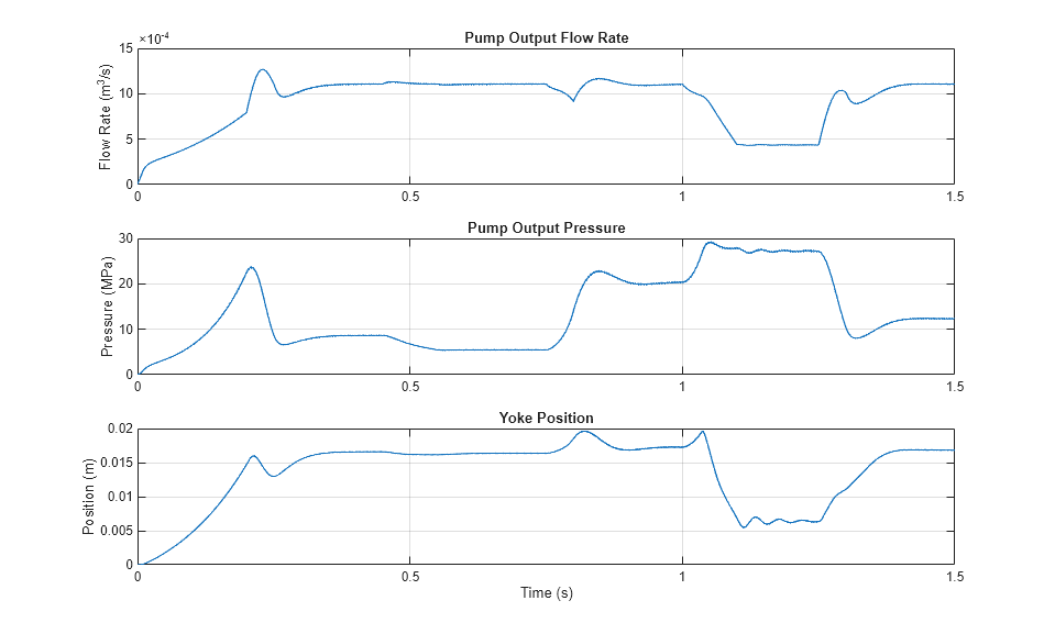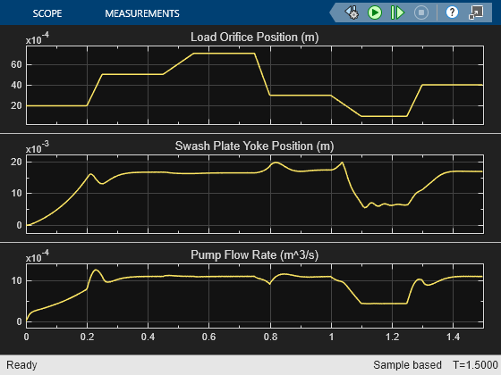 The control unit is modeled by the Pressure/Flow Control Unit subsystem. The load-sensing function of the pump control uses an orifice installed on the output flow path of the pump. The control unit keeps the pressure differential across this orifice constant regardless of the pump loading by adjusting the yoke displacement, which affects the tilt angle of the pump swash plate. This helps maintain the desired the flow rate through the orifice as well as prevent the pump pressure from exceeding the preset value.