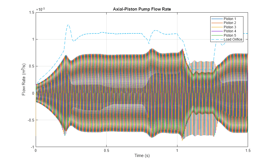 This plot shows the flow rate within the axial-piston pump. The cyclic nature of the piston motion can be seen in the flow rate in each piston. The negative portion of the piston flow rate cycle corresponds to liquid being drawn in through valve plate A and the positive portion of the piston flow rate cycle corresponds to liquid being expelled through valve plate B. The combined effect of the five pistons results in the overall behavior of pump which produces a positive flow rate of about 1.1e-3 m^3/s through the load orifice.