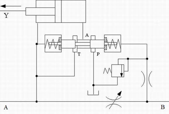 The purpose of the control unit is to implement two functions: load sensing and pressure limiting. Load sensing is implemented by maintaining a set pressure differential across a flow control orifice. The flow control orifice is installed in the output flow of the pump. The following figure shows the schematic of the control unit where the ports A and B are connected in series with the pump output.