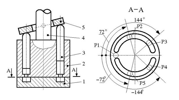 The pistons are spread evenly along the pitch circle of the cylinder block, as shown in Figure 1. This makes the angle between pistons 360/5 = 72 degrees. Therefore, the phase angles of the Valve Plate Orifice (IL) blocks of each piston is offset from the previous piston by 72 degrees. This results in the evenly distributed and overlapping open flow areas for the intake groove as shown in the second subplot.
