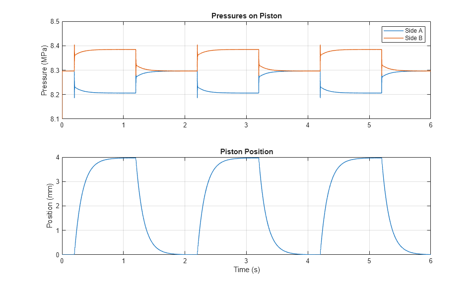 The plots below show the pressures acting on the piston and the position of it.
