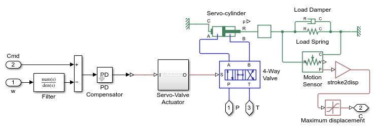This example demonstrates the use of secondary control for a hydrostatic transmission with a pressure-compensated pump and a variable-displacement motor. The transmission drives a winch that lifts a mass and acts against a viscous damper. The secondary control unit introduces closed-loop control with angular velocity feedback. It contains a servo-cylinder controlled by a proportional 4-way valve, and the servo-cylinder controls the motor's control member, which is represented by a mass, spring, and damper. The dynamic compensator in the model improves system stability.
