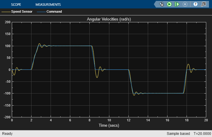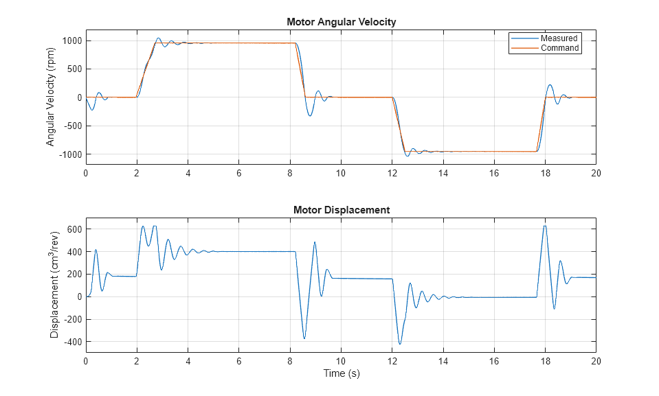 The plots below show the commanded and measured angular velocities of the motor and the displacement of the motor.