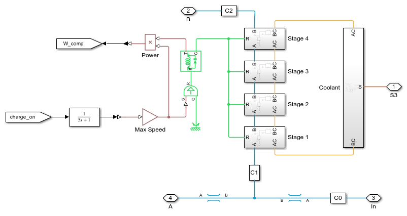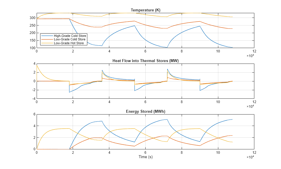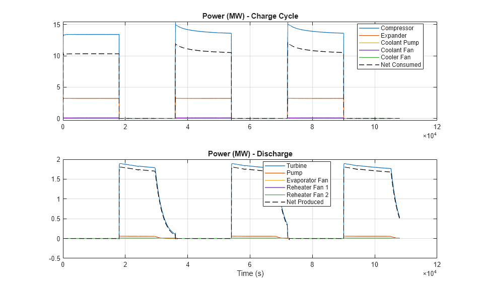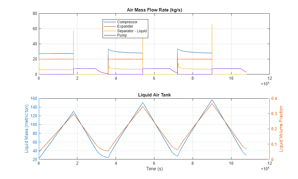 The bottom subplot shows the mass of liquid air in the tank. Starting from the second charge cycle, about 150 metric ton of liquid air is produced and stored in the tank. As seen in the scope, this corresponds to about 15 MWh of energy storage.