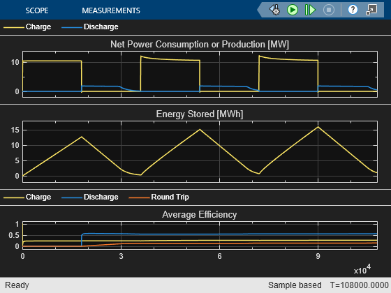 The scope shows the net power consumed to liquefy air during the charge cycle and the net power produced from the stored liquid air during the discharge cycle. About 10 MW is consumed during charge and 1.8 MW is produced during discharge. The charge and discharge phases run for 10 hours each, allowing the system to store about 15 MWh of energy, calculated based on the enthalpy difference between atmospheric air and liquid air. The time-averaged efficiency of the charge cycle is about 26% and the time-averaged efficiency of the discharge cycle is about 56%, resulting in an overall round-trip efficiency of about 15%.
