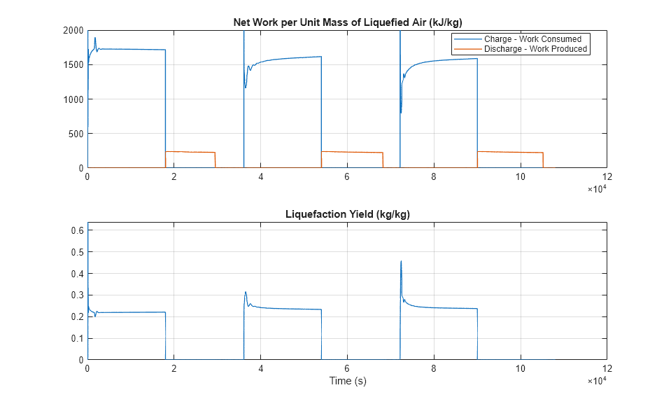The top subplot shows the mass flow rates of air through the key components in the system. During the charge cycle, the compressor drives about 27 kg/s of air through the liquefaction system. Over 70% of the compressed air is diverted through the expander to recover some of the work and improve cycle efficiency. About 6.5 kg/s of liquid air is produced. During the discharge cycle, the pump consumes 7.5 kg/s of liquid air from the tank to run the turbines.