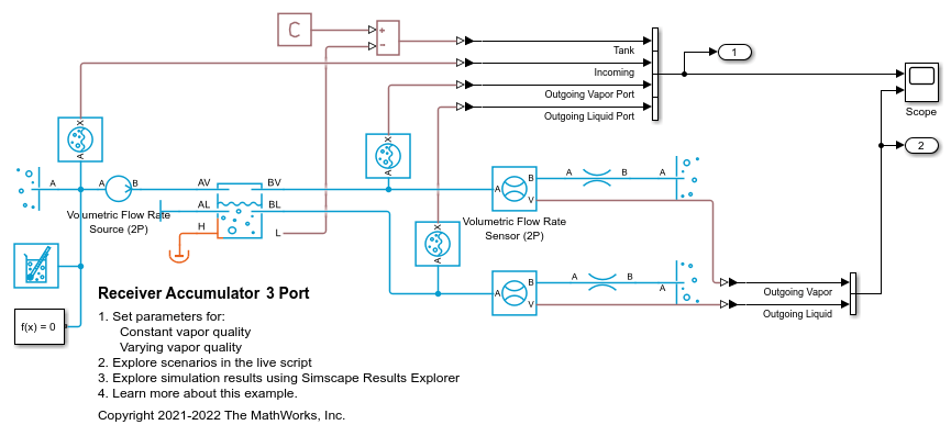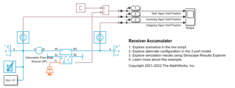 This configuration shows the Receiver Accumulator (2P) block with 3 ports connected, 1 incoming port and 2 outgoing ports. This model shows the separation of the liquid and vapor within the Receiver Accumulator (2P) block. It can be seen that as the vapor void fraction in the tank changes the vapor void fraction at ports and the mass flow rate out of the ports AV and BV remain constant and the mass flow rate out of the ports changes to adjust for the vapor void fraction of the tank.