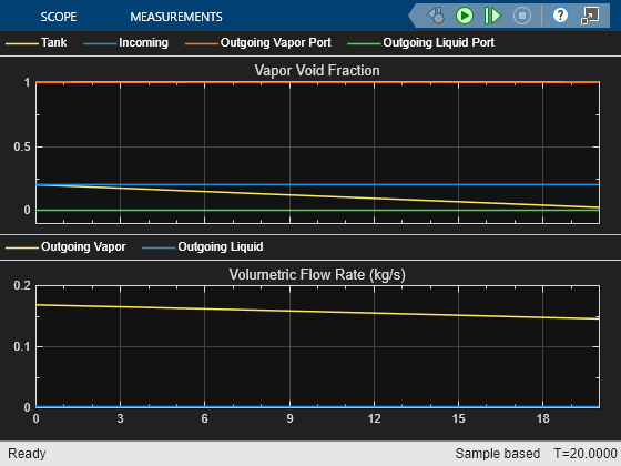 The physical signal port L of the Receiver Accumulator (2P) block reports the liquid volume fraction of the total container volume. In this example the vapor volume fraction of the signals connected to the receiver accumulator are reported using Vapor Quality Sensors. To create comparable plots for all the monitored values, the Vapor Quality sensor are set to report the vapor void fraction in the signals and the liquid volume fraction reported from the tank is converted to vapor volume fraction using a PS Subtract block.