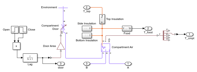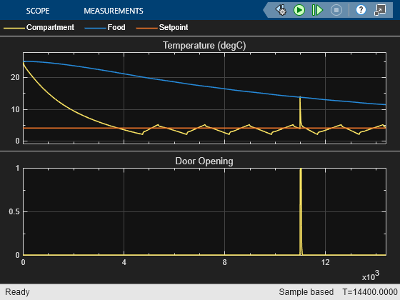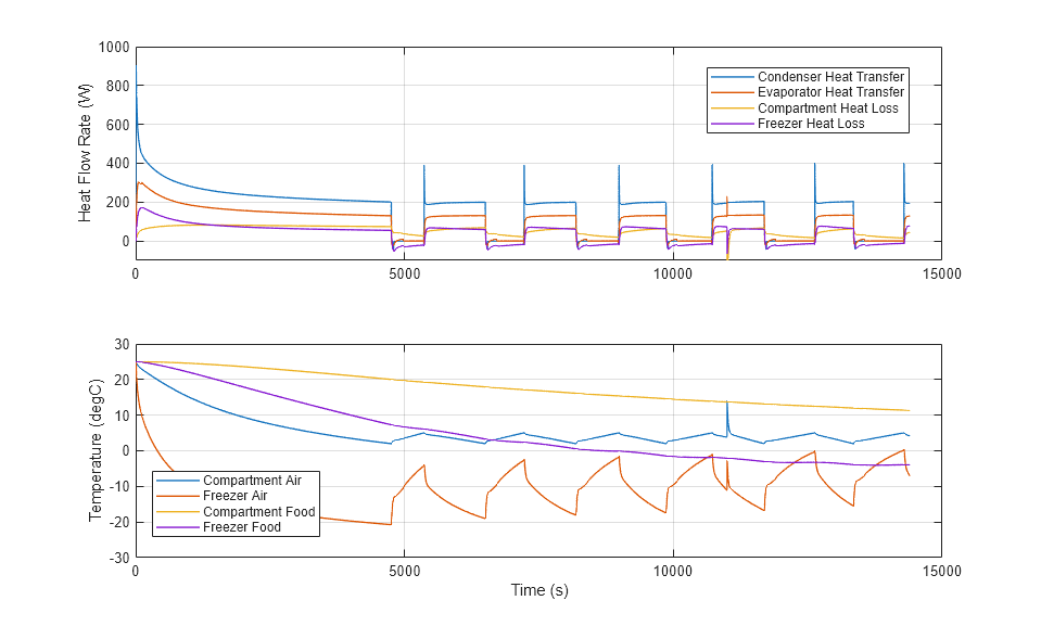 This plot shows the rate of heat transfer between refrigerant and moist air in the condenser and evaporator as well as the rate of heat loss through the insulation of the compartment and freezer. It also shows the temperature of cold air and food in the compartment and freezer. At 11000 s, the compartment door is opened for 60 s, resulting in a spike in compartment temperature.