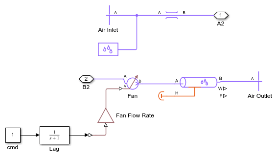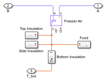 This example models a basic refrigeration system that transfers heat between the refrigerant two-phase fluid and the environment moist air mixture. The compressor drives the R134a refrigerant through a condenser, a capillary tube, and an evaporator. An accumulator ensures that only vapor returns to the compressor.