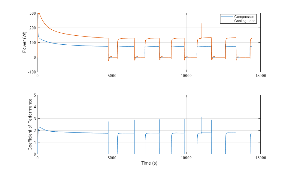 This plot shows the power consumed by the compressor and the cooling load of the refrigeration system, which is the rate of heat transfer in the evaporator. The coefficient of performance is the ratio of the cooling load and the power consumed.