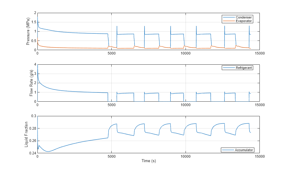 This plot shows refrigerant pressure and mass flow rate. The high pressure line is at around 1 MPa and the lower pressure line is at around 0.1 MPa. The nominal refrigerant flow rate is 1 g/s. The plot also shows the liquid volume fraction in the accumulator.