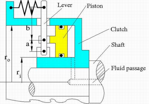 This example uses a Rotating Single-Acting Actuator (IL) block to model a hydraulic cylinder actuator for operating friction clutches, brakes, and other devices installed on rotating shafts. A key element of the actuator is a piston that moves back and forth under an axial force that consists of the static pressure force and a rotating cylinder force developed by centrifugal force on the rotating fluid.
