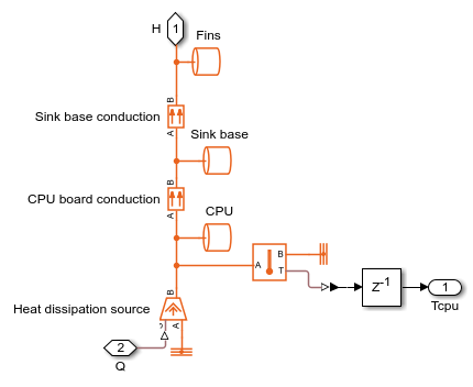 This example shows a simple CPU cooling system consists of a heat sink, a CPU fan, and fan controllers. The heat generated by the CPU is transferred to the heat sink by conduction and it is dissipated to the cooling air by forced convection mechanism. The heat sink is a parallel plate fin with rectangular fins between the plate fins. The CPU fan moves air across the heat sink by drawing air into the case grille from the outside and ejecting warm air from inside. The fan controller unit includes three control levels, representing a 3-speed switch, according to the CPU temperature. For lower CPU temperature, the fan speed is decreased and for higher temperature it is increased.
