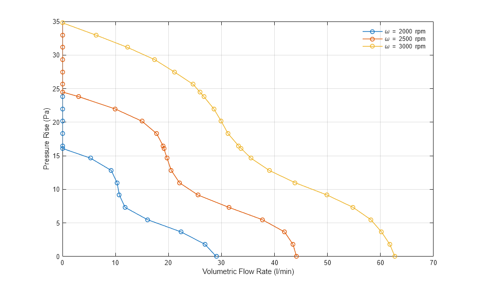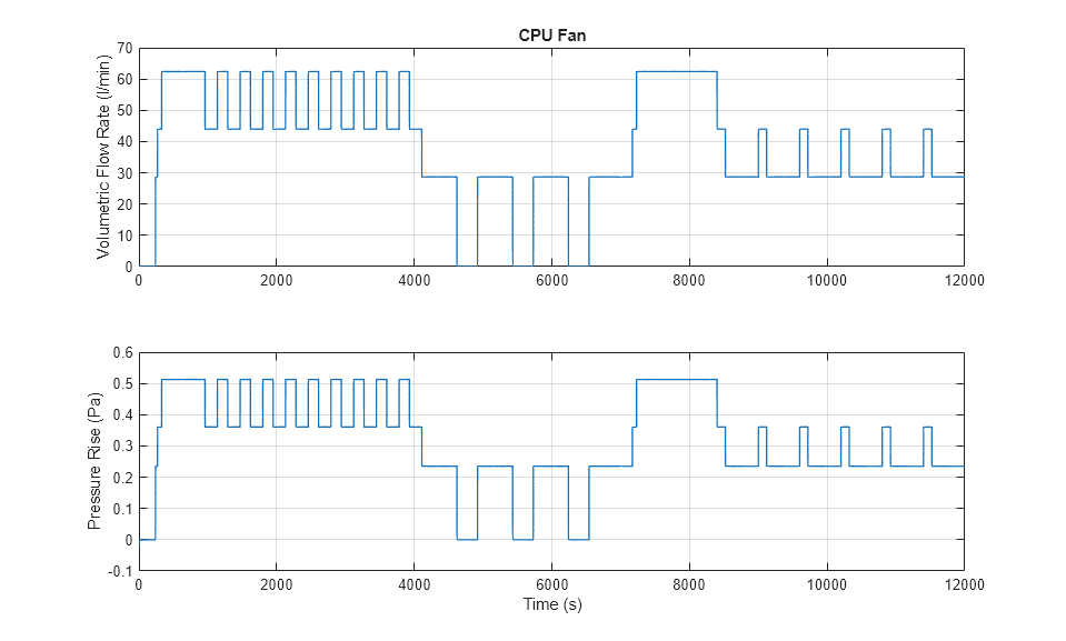 The plots below show the volumetric flow rate through and pressure rise across the CPU fan.