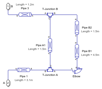 The cycle simulated in the example allows you to observe pressures and flow rates at various points of the system. The example also shows the usage of local resistance blocks such as the Elbow, T-junction, and Sudden Area Change.