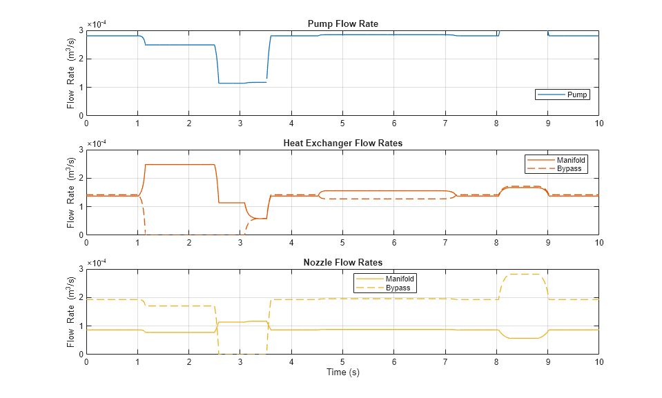 The plots below show the flow rates through different parts of the lubrication system. As the control member within the different valves are adjusted, flow rates change within the system.