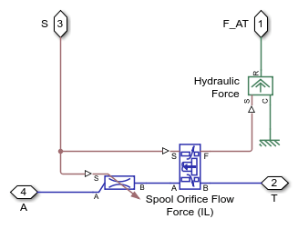This subsystem shows how the fluid pressure at port A is modeled as a force on the spool left face.