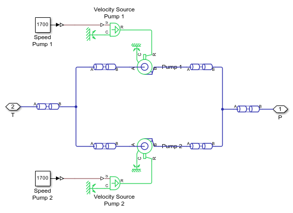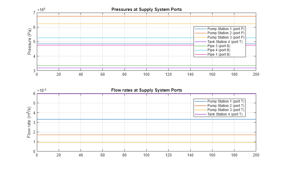 . Each pumping station consists of two centrifugal pumps installed in parallel with prime movers rotating at 1700 rpm. The pump characteristics are specified using lookup tables. All pipes are modeled using Pipe (IL) blocks.