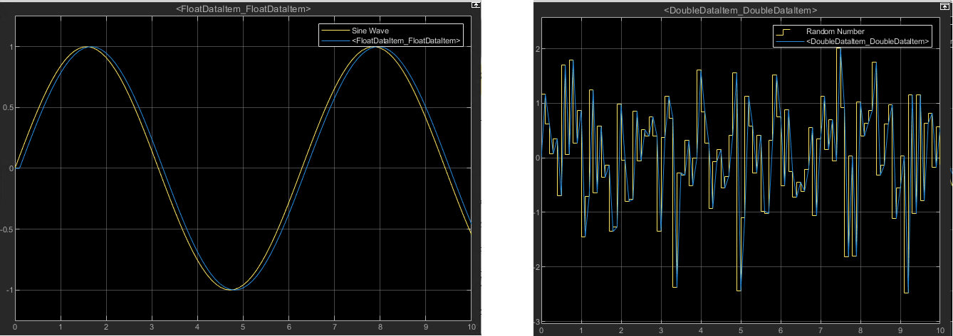 This image shows a model where an OPC UA Write and an OPC UA Read block are configured to write to and read from the node named FloatDataItem. This model writes the signal from the Sine Wave block to the OPC UA node FloatDataItem and reads the value at the node FloatDataItem. You can view the read values along with the original Sine Wave signal using a Scope block. You can view the timestamp and quality of the read data using the Display block. In this example, the Value port of the OPC UA Read block is a scalar Simulink signal as the block reads data from one node.