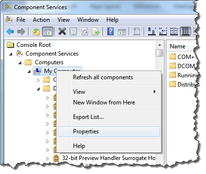 Component Services > Computers > My Computer. Right-clickMy Computerand select Properties.