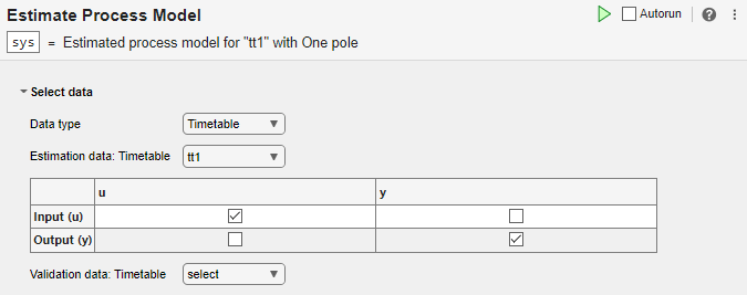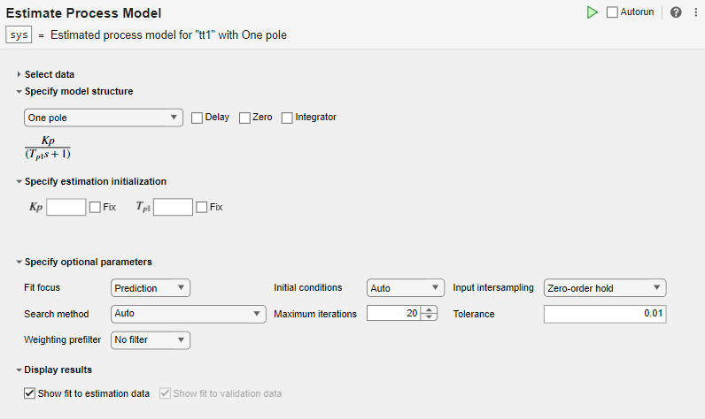 The Estimate Process Model task lets you interactively estimate and validate a process model for SISO systems. You can define and vary the model structure and specify optional parameters, such as initial condition handling and search methods. The task automatically generates MATLAB® code for your live script. For more information about Live Editor tasks generally, see Add Interactive Tasks to a Live Script.