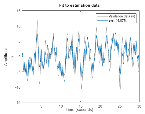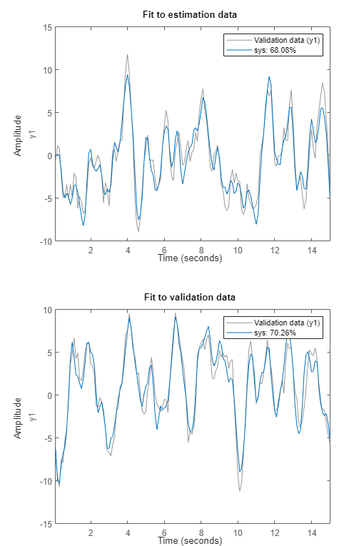 The fit to the estimation data is somewhat worse than in Estimate Process Model with Live Editor Task. Estimation in the current example has only half the data with which to estimate the model. The fit to the validation data, which represents the goodness of the model more generally, is better than the fit to the estimation data.