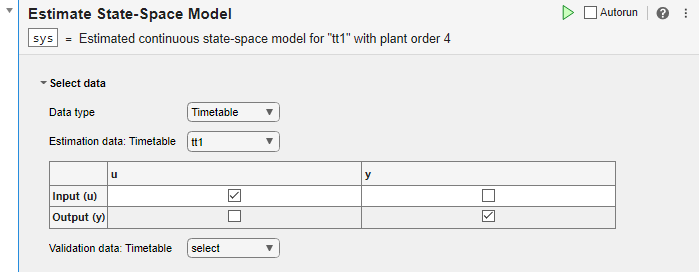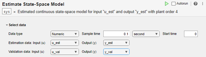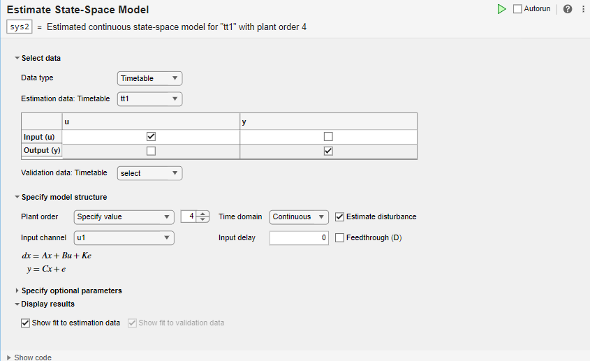 The Estimate State-Space Model task lets you interactively estimate and validate a state-space model using time or frequency data. You can define and vary the model structure and specify optional parameters, such as initial condition handling and search method. The task automatically generates MATLAB® code for your live script. For more information about Live Editor tasks generally, see Add Interactive Tasks to a Live Script.