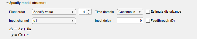 In the Specify model structure section, the plant order is set to its default value of 4 and the model is in the continuous-time domain. Equations below the parameters in this section display the specified structure.