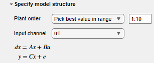 The example Estimate State-Space Model with Live Editor Task recommends a model order of 2. Use that value for Plant Order. Leave other parameters at their default values. Note that Input Channel refers not to the input data set, but to the channel index within the input data set, which for a single-input system is always u1.