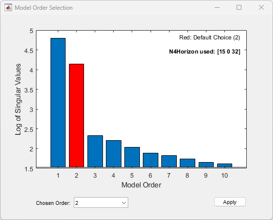 Specify value— Specify the order of the model explicitly.Pick best value in range— Specify a range of values, such as1:10. When you run the task, the Hankel singular-value plot visualizes the relative energy contribution of each state in the estimated model and recommends the lowest order that reproduces critical dynamic behavior. Proceed with this recommendation or select another order in Chosen Order. Click Apply to accept the model order and proceed.