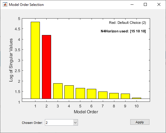 • If you want to compare a range of potential orders to choose the most effective order for your estimated model, specify that range for nx. n4sid creates a Hankel singular-value plot that shows the relative energy contributions of each state in the system. States with relatively small Hankel singular values contribute little to the accuracy of the model and can be discarded with little impact. The index of the highest state you retain is the model order. The plot window includes a suggestion for the order to use. You can accept this suggestion or enter a different order. For an example, see Determine Optimal Estimated Model Order.