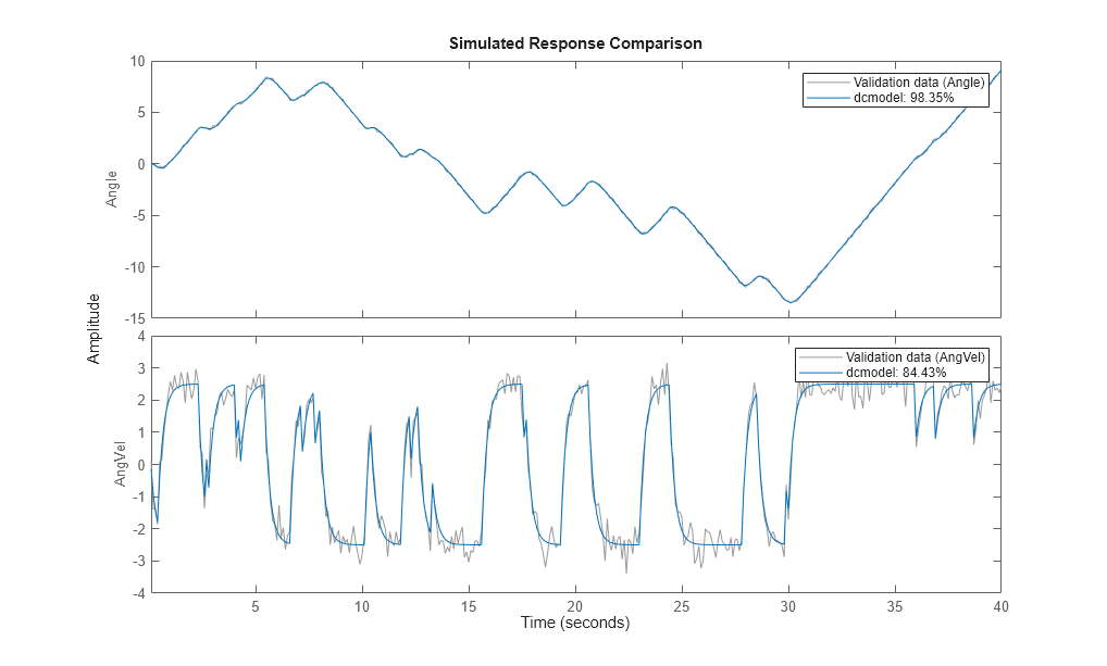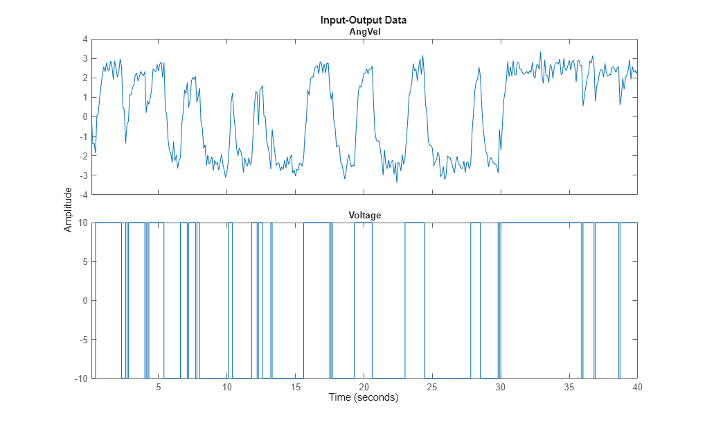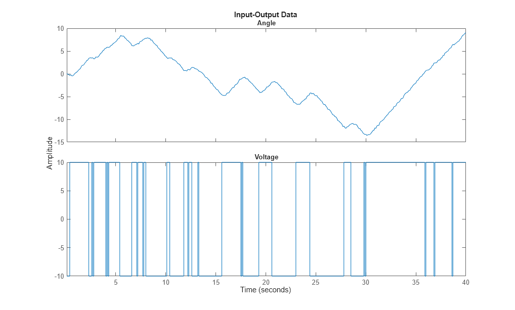 z = iddata(y,u,0.1); % The IDDATA object z.InputName = 'Voltage'; z.OutputName = {'Angle';'AngVel'}; plot(z(:,1,:))