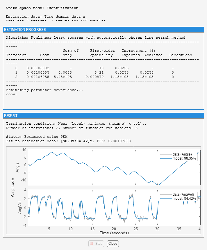 A = [0 1; 0 -1]; % initial guess for A(2,2) is -1 B = [0; 0.28]; % initial guess for B(2) is 0.28 C = eye(2); D = zeros(2,1);